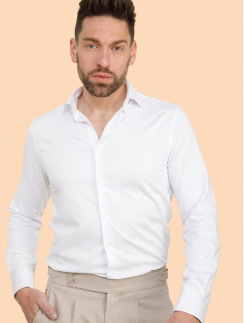 Camisa blanca de vestir per a home, dissenyada per als que busquen elegància, versatilitat i una imatge impecable en qualsevol ocasió. Una camisa blanca per portar amb vestit, amb puny doble per bessons, ideal per a cerimònia, nuvi o convidat, i perfecta per a oficina, esdeveniments i ocasions formals. Composició: 50% viscosa (bambú) · 46% polièster · 4% elastà.