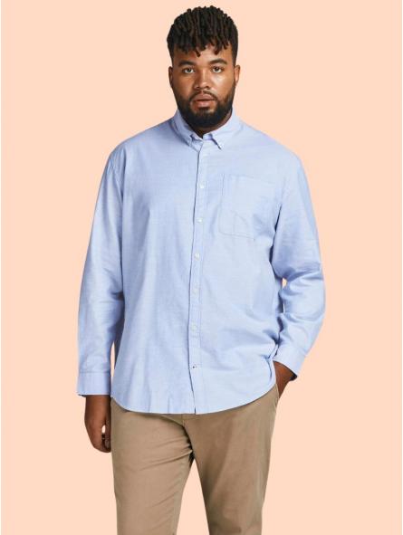 Una camisa de talles grans confeccionada en teixit d'oxord en color blaucel, es converteix en una peça inprescindible en el teu armari, la podràs combinar amb una de les nostres americanes i uns texans, aportant el teu look un aire jucenil i contemporani.