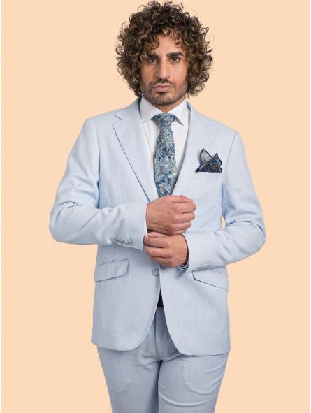 Vestit de tall SLIM FIT. El vestit adaptat a tots els cossos d'igual manera on l'estil predomina sobre la resta. Amb solapa picada al cantell i dues pinces al davanter, els seus pantalons són de tir mitjà amb cintura elàstica adaptable i baix de 18, el llarg de l'americana és 72.