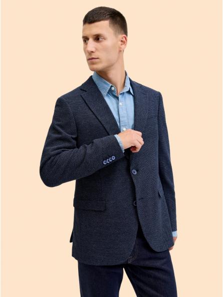 Chaqueta azul de tejido estructurado con un diseño elegante y versátil, ideal tanto para ocasiones formales como para looks más informales. Presenta solapas clásicas, cierre con dos botones, bolsillos frontales con solapa y puños con botones decorativos. Su tejido elástico garantiza comodidad y libertad de movimiento durante todo el día.