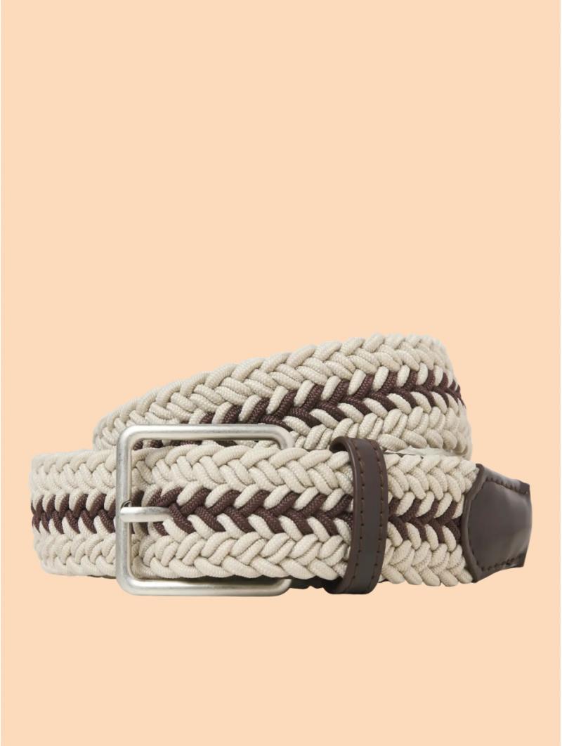 Cinturón trenzado elástico de alta calidad, diseñado para ofrecer comodidad, ajuste perfecto y estilo casual elegante. Su combinación de tonos beige y marrón aporta un aspecto natural y versátil, ideal para looks informales cuidados.
