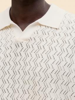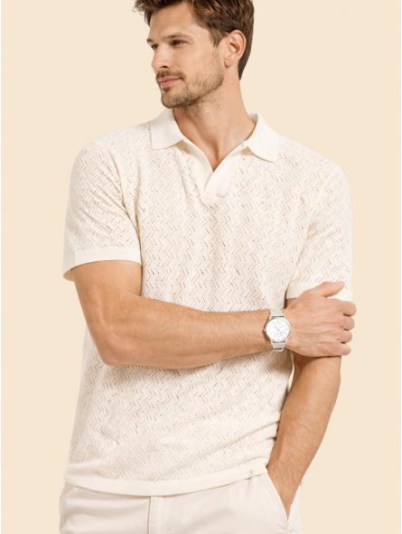 Polo hombre de punto calado con cuello abierto, tejido fino y suave, ideal para un estilo fresco y elegante en verano. Diseño moderno y transpirable, perfecto para combinar con chinos o vaqueros. Composición: 50% algodón · 50% poliéster reciclado.