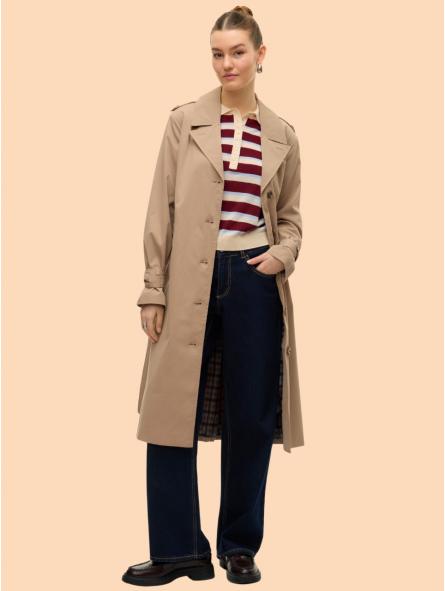 Trench clásico de mujer en color beige suave, con un diseño largo y elegante que aporta un aire atemporal y sofisticado. Presenta solapas anchas, botonadura y detalles de invierno en los hombros que resaltan su estilo icónico.