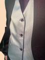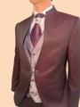 Chaqueta sin solapas con cuello tipo mao, que le da un toque distintivo y contemporáneo, chaleco con estampado brocado, reversible, añadiendo un contraste elegante y detallista, pantalones de corte recto-slime, que complementan el conjunto con un ajuste clásico y estilizado, corbata con plastrón y pasador, aportando formalidad y distinción.