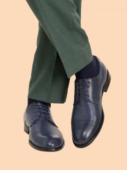 Zapato de vestir masculino de color azul marino liso con puntera y mejilla picada para darle este toque más elagante, el cierre es tipo derbi para mayor comodidad y ajuste, el interior está forrado en piel para mayor suavidad